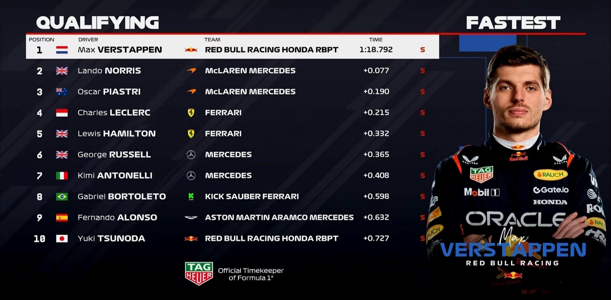 第1-第5:维斯塔潘、诺里斯、皮亚斯特里、勒克莱尔、汉密尔顿